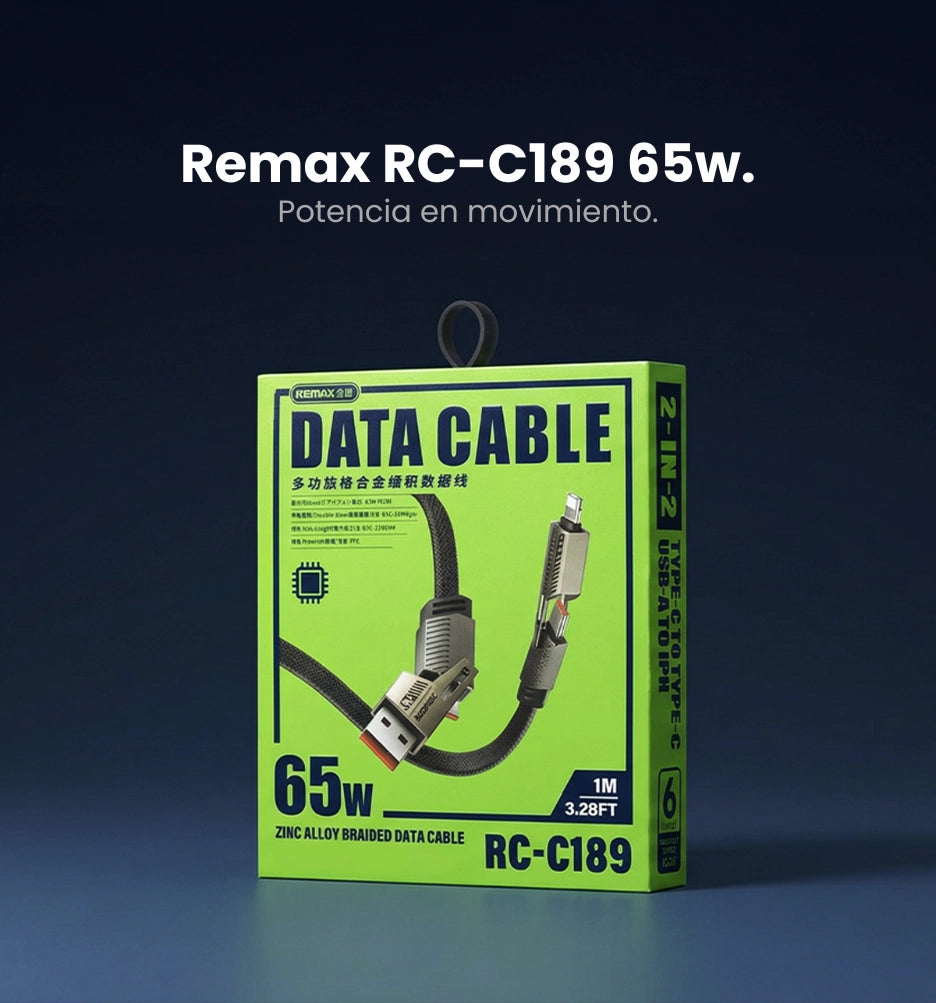 Si te cansaste de andar con varios cables, este es el que simplifica todo. El REMAX RC-C189 es un cable 4-en-1 de 1 metro, diseñado para que puedas cargar (y también sincronizar) distintos dispositivos con una sola solución: USB-C o USB-A por un lado, y USB-C o Lightning por el otro.
