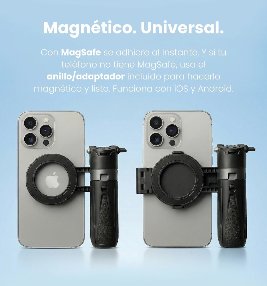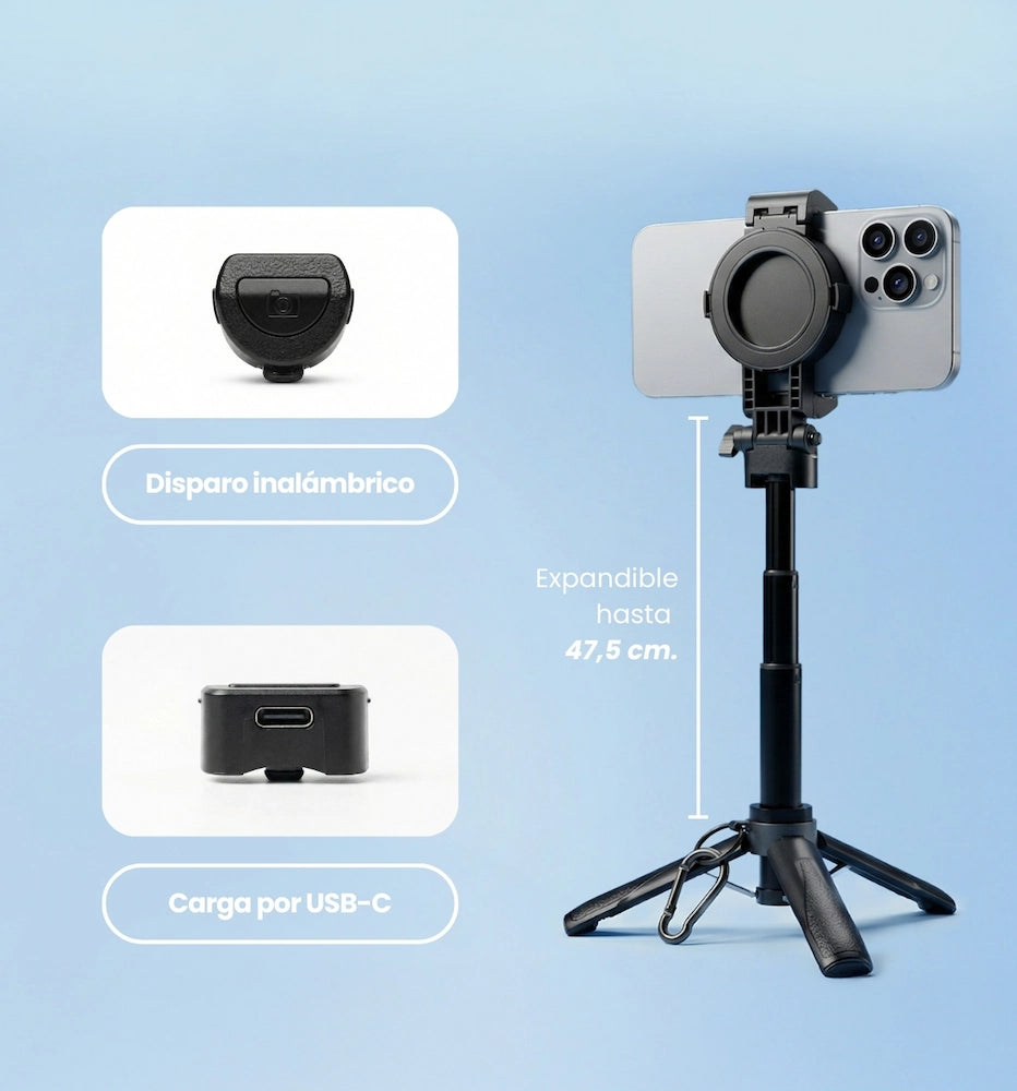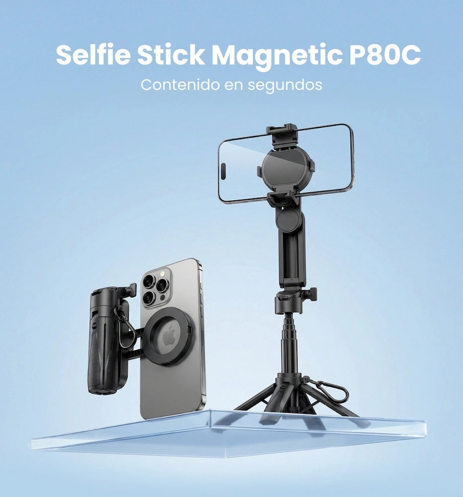 Su sistema magnético permite una conexión rápida y segura, y si tu teléfono no es compatible, incluye una pieza magnética para que igual puedas usarlo. Además, su rango de extensión te da más control del encuadre (de tomas cercanas a planos grupales) y el soporte con rotación 360° te deja ajustar el ángulo exacto que quieres.
