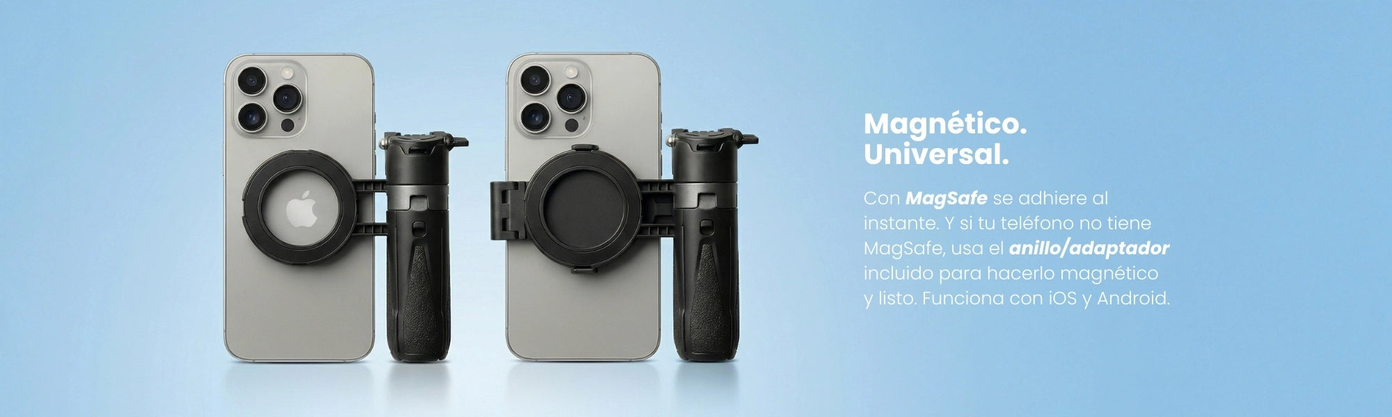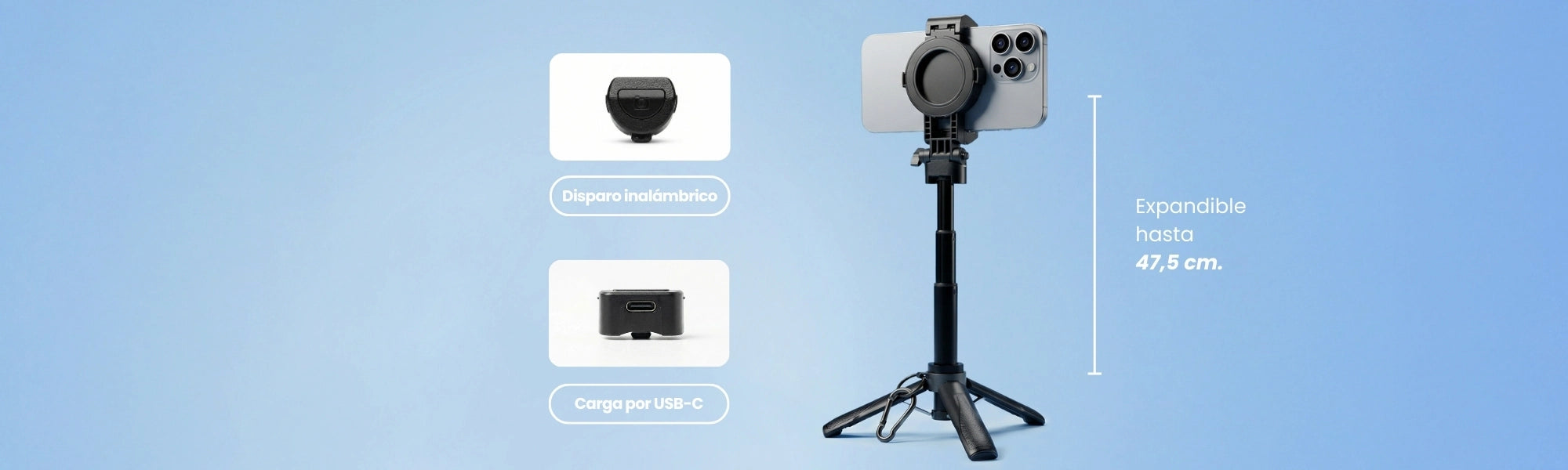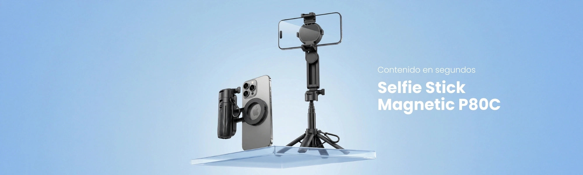 Su sistema magnético permite una conexión rápida y segura, y si tu teléfono no es compatible, incluye una pieza magnética para que igual puedas usarlo. Además, su rango de extensión te da más control del encuadre (de tomas cercanas a planos grupales) y el soporte con rotación 360° te deja ajustar el ángulo exacto que quieres.